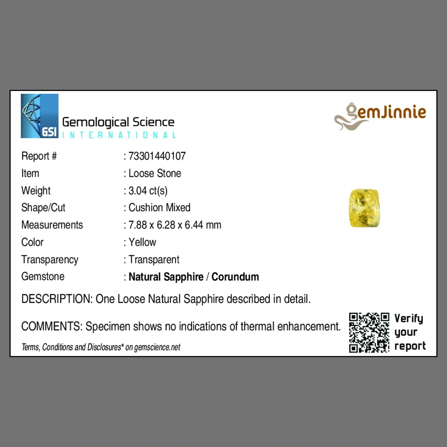 Experience the brilliance of this 3.04 Carat Yellow Sapphire (Cushion Mixed Cut), a natural and transparent gemstone from the Corundum family. Known for attracting prosperity, wisdom, and success, this stunning sapphire radiates vibrant golden hues and exceptional clarity — perfect for fine jewelry or astrological purposes