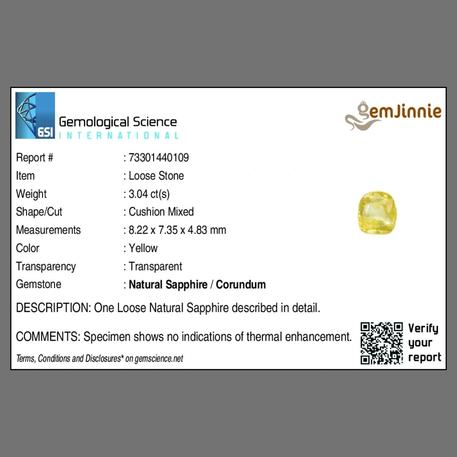 Experience the brilliance of this 3.04 Carat Yellow Sapphire (Cushion Mixed Cut), a natural and transparent gemstone from the Corundum family. Known for attracting prosperity, wisdom, and success, this stunning sapphire radiates vibrant golden hues and exceptional clarity — perfect for fine jewelry or astrological purposes