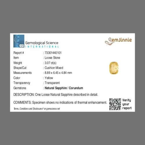 Experience the brilliance of this 3.07 Carat Yellow Sapphire (Cushion Mixed Cut), a natural and transparent gemstone from the Corundum family. Known for attracting prosperity, wisdom, and success, this stunning sapphire radiates vibrant golden hues and exceptional clarity — perfect for fine jewelry or astrological purposes